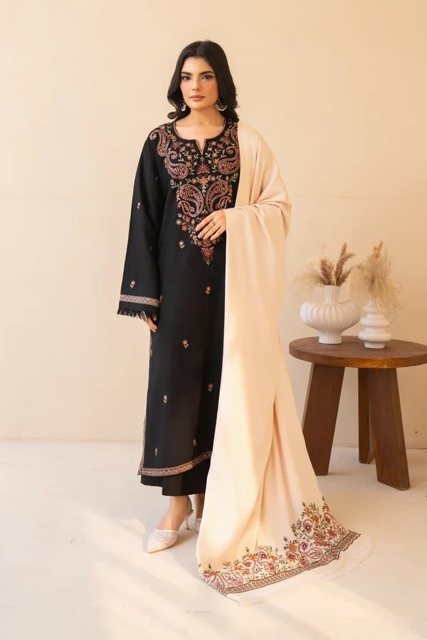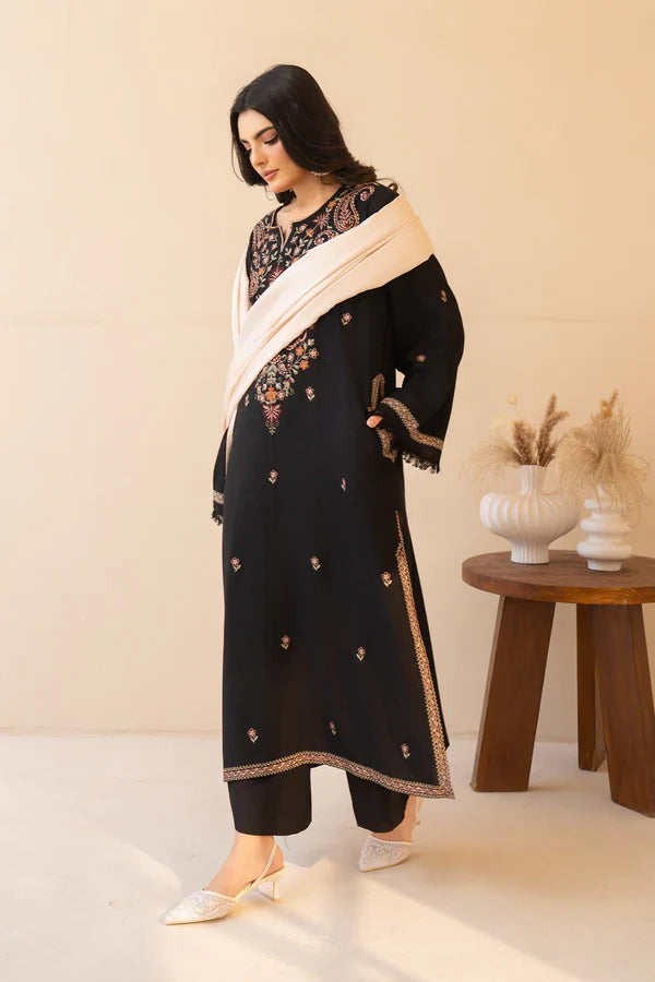 Elegant black 3-piece embroidered suit featuring intricate Kashmiri-inspired detailing, paired with a matching trousar for a timeless winter look.